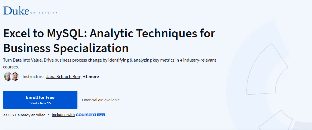 In this Specialization, you’ll learn to frame business challenges as data questions. You’ll use powerful tools and methods such as Excel, Tableau, and MySQL to analyze data, create forecasts and models, design visualizations, and communicate your insights. In the final Capstone Project, you’ll apply your skills to explore and justify improvements to a real-world business process.